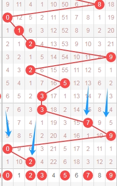 上图是体彩七星彩从左到右定位第二位数字,我标注出来的蓝色箭头表示合数数字,很明显蓝色小箭头多合数多,那么本期第二位数字继续关注出质数12357,个人最看好数字1235。
