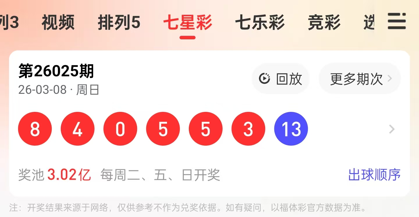 最新一期七星彩回顾(2026年3月8日,期号2026025)