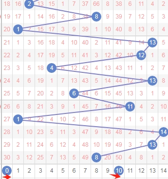 上图是体彩七星彩从左到右定位第二位数字,我标注出来的数字都是偶数数字,我标注出来的蓝色箭头表示奇数数字,很明显最近十几期开出的奇数数字多,那么本期第二位数字可以关注出偶数数字02468,个人最看好数字0268。
