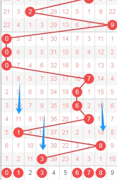 上图是体彩七星彩从左到右定位第一位数字,我标注出来的数字都是遗漏周期小的数字013678,我标注出来的蓝色箭头表示遗漏周期,上期开出数字3遗漏周期是12期,上上次开出数字8遗漏周期是18期,那么本期可以关注出遗漏周期小的数字 ,个人最看好数字0136。