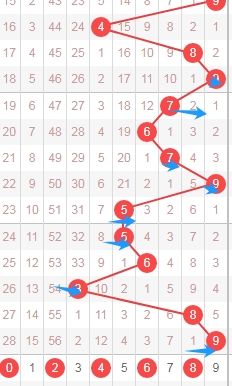 上图是体彩七星彩从左到右定位第六位数字,我标注出来的数字都是遗漏周期小的数字,我标注出来的蓝色箭头表示遗漏周期,上期开出数字0遗漏周期是9期,上上上次开出数字6遗漏周期是24期,那么本期可以关注出遗漏周期小的数字013679,个人最看好数字01369。