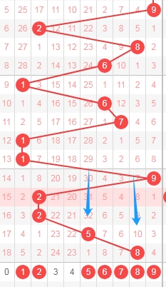 上图是体彩七星彩从左到右定位第五位数字,我标注出来的数字都是遗漏周期小的数字,我标注出来的蓝色箭头表示遗漏周期,上期开出数字5遗漏周期是7期,上上次开出数字2遗漏周期是10期,那么本期可以关注出遗漏周期小的数字124589,个人最看好数字12489。