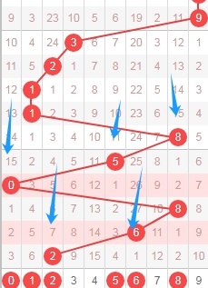 上图是体彩七星彩从左到右定位第四位数字,我标注出来的数字都是遗漏周期小的数字,我标注出来的蓝色箭头表示遗漏周期,上期开出数字2遗漏周期是7期,上上次开出数字6遗漏周期是27期,那么本期可以关注出遗漏周期小的数字012568,个人最看好数字02568。