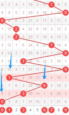 上图是体彩蓝球开奖号码走势分布图,我标注出来的数字是蓝球0尾数数字0 10,到本期为止蓝球0尾数数字已经连续遗漏了30期,那么本期或者近期大家还是要记得留意一下蓝球0尾数的数字。